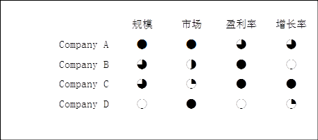 在 PPT 里面分析竞争态势最为常见的方法就是展示你的公司如何与主要竞争对手对抗,以及各家公司在哪个方面更具优势。你可以在横轴上设定各种产品特性或者是竞争差异化要素。月亮图不仅仅是一种谈论竞争对手的方式,也是给你一个机会去强调两件事:1、你认为顾客在消费时最看重的标准是什么?2、你如何看待自己的差异化竞争?