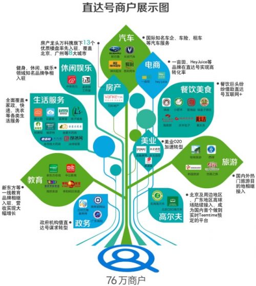 从近一年的发展来看,百度直达号目前已经发展商户76万家,已经连接了餐饮、旅游、娱乐、生活服务等各行业的商家,云家政、平安保险、Heyjuice、西湖、桂林旅游、新东方在线、平安车险、顺风速运、易到用车、百度高尔夫、万科、商务部、广东高院、韩国旅游局等。在效果上,可以看两个例子:一个是万科上线20天,线下认购额达到3.8亿元,新房成交近2000套;一个是桂林旅游直达号在核心景区网络渠道出票量占比超五成。类似的例子还有很多,各行业的连接实例以及商户所取得的业绩与收益,表明百度直达号已经成为商户转型移动互联网的最佳平台。