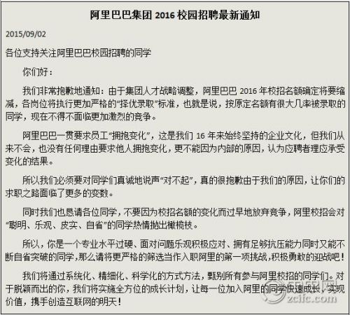 9月1日,阿里巴巴校园招聘官网上发布了最新一则公告称阿里巴巴2016年校招名额确定将要缩减。
