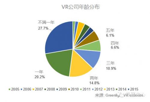 或许是受到Oculus被高价收购的刺激,近三成虚拟现实公司都是2014年下半年成立,尚不足1年;而0到1年的公司占了47.9%。