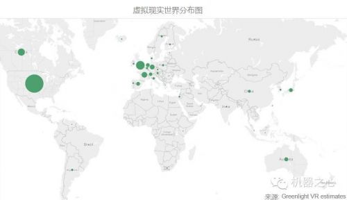 从公司数量上说,美国公司占据了虚拟现实公司一半的份额,而下图展现出全球范围内虚拟现实公司的分布,加拿大、西欧、日本、澳洲和中国都有一些公司。