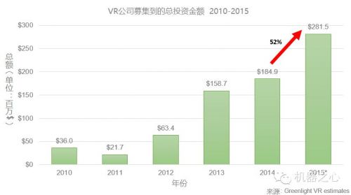 过去5年,虚拟现实行业共募得7.46亿美元,2014、15年迎来一股资本爆发期,尤其是截止到2015年6月,虚拟现实行业已经吸引到2.8亿美元的投资,较去年全年增长了52%,我们有理由相信今年全年的资本投资会远远高于这个数字。
