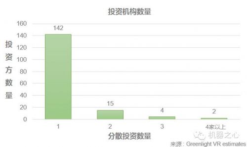 约有163家风投机构活跃于虚拟现实行业,约有90%的投资机构只投资了一家企业。绝大多数投资机构还处在观望状态,这也说明虽然融资额度不断创新高,但投资机构还持谨慎观望态度。