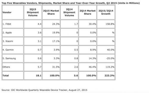 单从2015年2季度的数据看,全球智能穿戴产品的出货量达到了1810万台,相比去年同期的560万台,增长了223.2%,除了苹果和小米的加入增长,Fitbit和“其它”类别里的增长也是很明显的,Fitbit从去年的170万台增长到440万台,增长158.8%;其它类别也从260万台增长到570万台,增长119.2%,翻倍有余;唯一下滑的是三星,原因可能是Gear 2销量增长乏力。