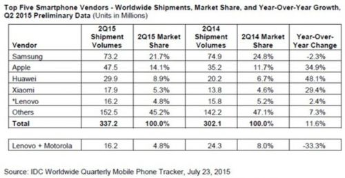 同样是来自IDC的数据,全球2015年2季度智能手机的出货量,前五的玩家中,与穿戴产品前五的玩家重合有3家,说明穿戴市场到底还是被这些移动终端厂商在把持,同时最大的玩家占比也就在20%左右,“other”超过40%,和穿戴产品一样,智能手机的长尾玩家也有很多。