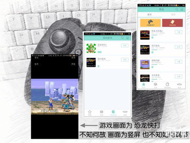 进入新游模拟器可以看到游戏较多 本文中测试的<恐龙快打>游戏不知何故 进入游戏是竖屏的 无论是否开启手机方向锁定也未能转换为横屏 实际游戏过程中 左右摇杆的“磨砂”并不明显,在游戏动作激烈时易滑出摇杆,影响操作且摇杆阻力较小 游戏人物移动中略显轻浮 真实感缺少点。右摇杆略挡手。