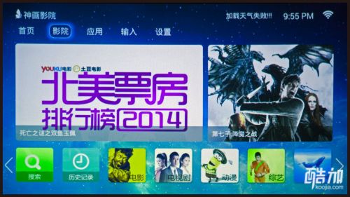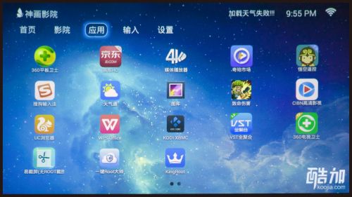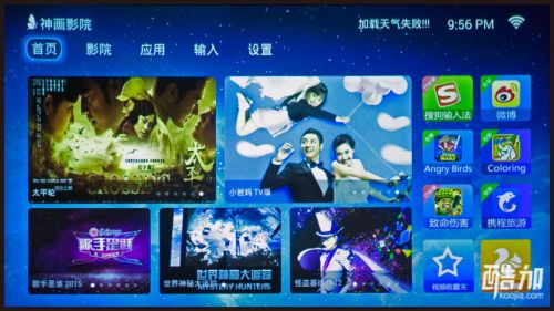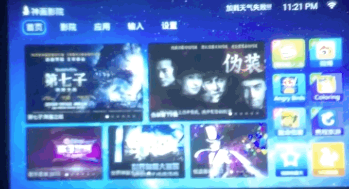 深入定制的android系统界面分为5个板块:首页、影院、应用、输入、设置。