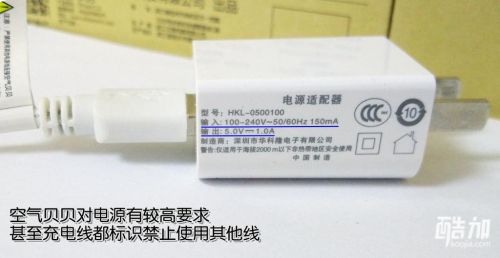 ▼ 空气贝贝配件包含数据线一根和充电头一个,但是看到此线材和充电头的标示发现贝贝对电源要求很严格,也许是为保护精密原件不受电压及电流波动导致损坏。那以后就注意不要拿手机充电器供电咯,注意:输入电压为100-240v~50/60Hz 150mA 输出 5.0v--1.0A