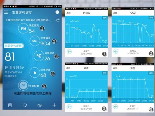 可以检测当前PM2.5 二氧化碳浓度 温度 湿度并生成曲线记录每刻的空气状况(此记录可在事件中查看)以及建议调节方法。