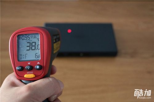 通过连续两小时的使用,触摸机器的顶面,可以感觉到中间Logo处略有点热,其它平面只有温温的感觉,使用测温仪对机器各部位的发热程度进行测定,最高温度处仅为38℃,可见芒果小觅在散热控制方面还是很到位的